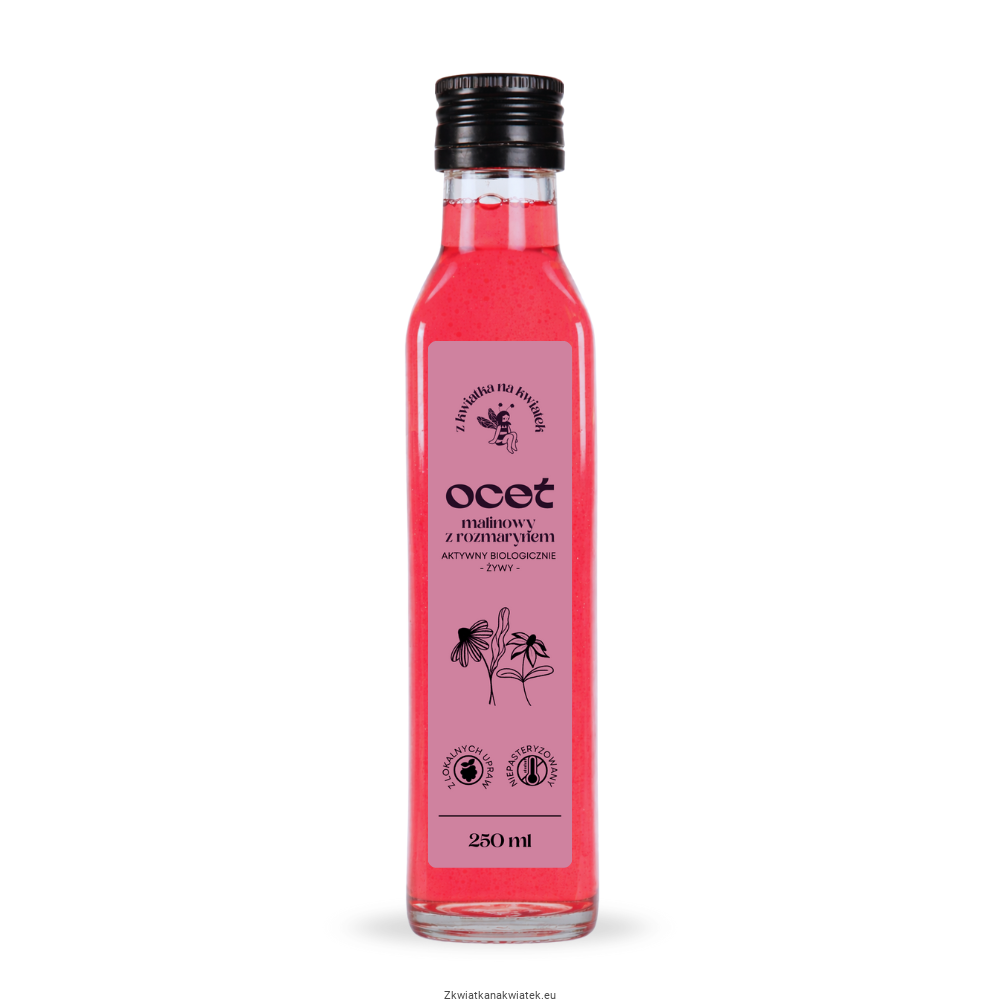 Żywy, aktywny biologicznie ocet malinowy, niepasteryzowany, niefiltrowany.