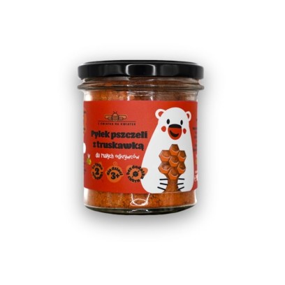 Prosty skład: delikatny pyłek pszczeli i liofilizowana truskawka. Bez dodatku cukru, bez konserwantów.